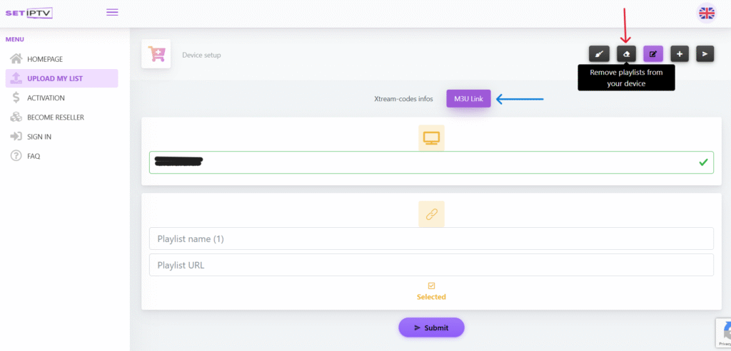 Besuche https://setsysteme.com/set.app und gib deine MAC-Adresse in das obere Feld ein, das auf dem Bild angezeigt wird. Klicke dann auf die Schaltfläche mit dem Text „Remove playlists from your device“ oben rechts. Wenn du keine alten Playlists hast, die du nicht mehr nutzt, kannst du diesen Schritt überspringen.