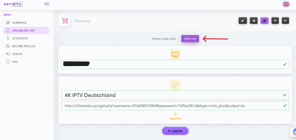 Füge deinen M3U-Link in das Feld „url m3u“ ein und schreibe „4K IPTV Deutschland“ in das Feld „Playlist Name“. Speichere, indem du auf „Submit“ klickst. Starte deine App auf dem TV neu, und schon sollten deine Kanäle angezeigt werden!